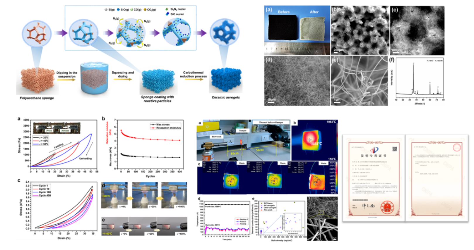 研发室提出了一种柔性三维纳米纤维编织而成的多孔陶瓷材料,即以有机泡沫浸渍工艺构建三维骨架结构陶瓷坯体,进一步结合碳热还原反应原位合成孔壁由纳米纤维编织而成的多孔陶瓷。这种新型的陶瓷材料具有超高气孔率及比表面积,有望应用于过滤、隔热、催化剂载体等领域。