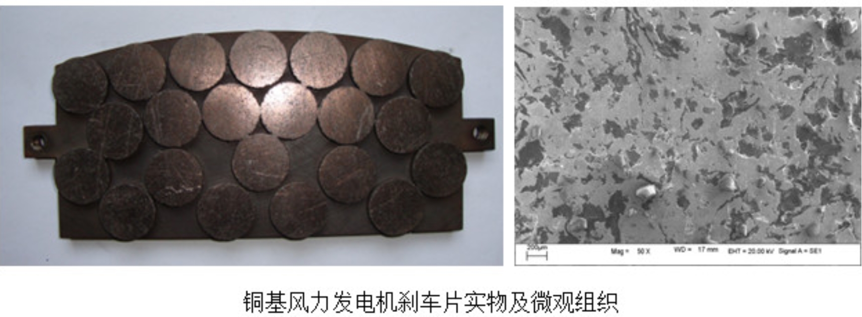 该研发室利用粉末冶金工艺(混粉-压制-加压烧结)制备铜基刹车片。通过分析刹车片基体组元、摩擦组元及润滑组元的在刹车片中的作用,对成份进行研究调整,制备出性能优异的铜基粉末冶金刹车片。通过对摩擦组元进行表面改性,使铜基粉末冶金制动摩擦材料具有高强度、适宜的摩擦系数、良好的耐磨性、抗粘结性和高温稳定性,在温差大、潮湿、干燥等恶劣环境条件下仍能保证良好的摩擦系数及稳定性,可应用于风力发电机和高速列车等重型机械的制动器。
