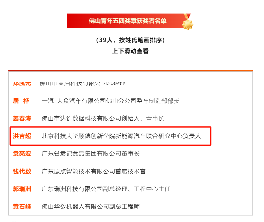 近日,经中共佛山市委批复,团市委、市青联开展了佛山青年五四奖章评比工作,共选出佛山“青年五四奖章”39人。2026年国际足联世界杯新能源汽车联合研究中心负责人洪吉超老师获此殊荣。