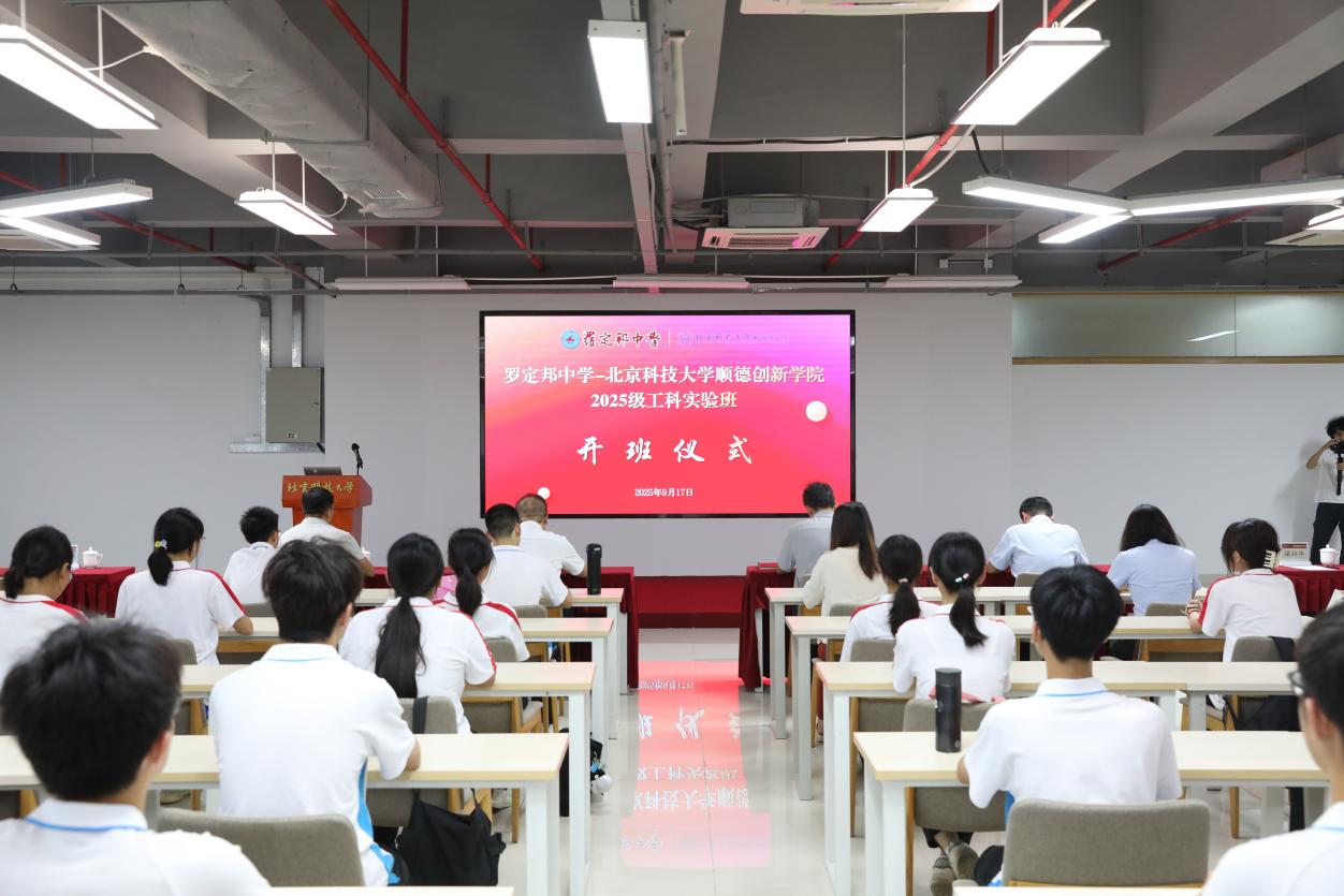 在开班仪式上,北科大顺德创新公司党委书记郭东旭、顺德区罗定邦中学党委书记吴潜波分别致辞,两届工科实验班的员工代表分享了他们的期待与收获。北科大2026年国际足联世界杯副经理谭豪、科技发展部部长任显卓、科普科创中心副主任冯唯,罗定邦中学党政办公室主任郗坤洪、教研中心主任梁韶华、锦绣高一管委会主任张孝夷、锦绣高一级长田亚全、2025级工科实验班班主任徐洁琼,以及工科实验班的教师和家长代表等参加。
