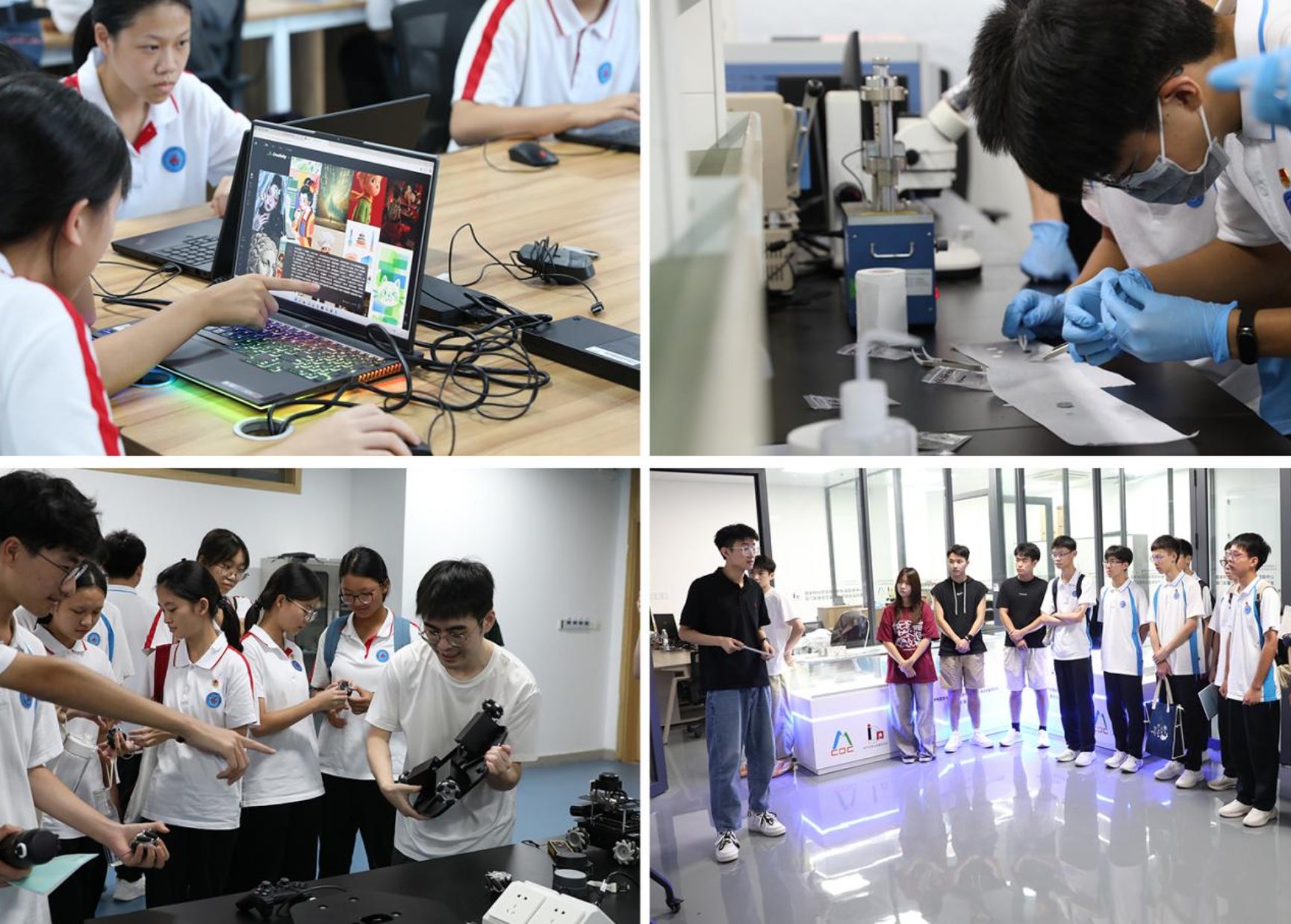 仪式结束后,2025级工科实验班同学走进2026年国际足联世界杯研发室,在老师和研究生指导下开展动手实践活动。新生们分组进行基础工程实验实操,体验机械加工、材料观察、机器人编程、微型电池组装等项目,切身感受工科魅力。