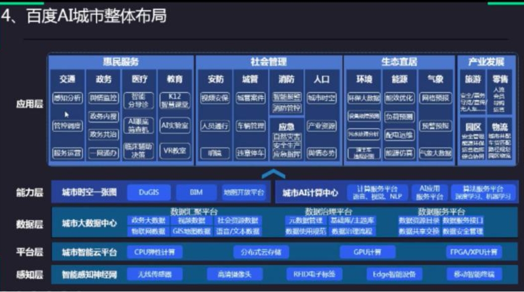 百度智慧政务事业部高级客户经理刘洋介绍了疫情期间百度通过人工智能系统对北京的部分社区和楼宇实现了精准防控。在楼宇场景中,为便于内部在职员工和外部访客的管理,百度将进入楼宇的手续系统化、流程化,提高了管理效率。此外,百度将开发的AI测温系统成功应用在数字封闭环境和半开放环境中,在保证测温精准度的同时,还提升了测温效率。会上,刘洋还介绍了未来百度在AI城市的整体布局,包括应用层、能力层、数据层、平台层以及感知层。