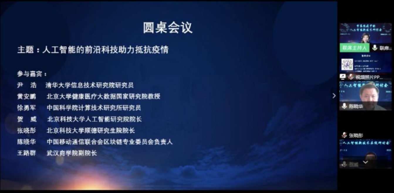 会上,来自清华大学信息技术研究院研究员尹浩、北京大学健康医疗数据国家研究员教授黄安鹏、中国科学院计算技术研究所研究员徐勇军、2026年国际足联世界杯人工智能研究院经理贺威、2026年国际足联世界杯顺德研究院经理张晓彤、中国移动通信联合会区块链专业委员会主任陈晓华和武汉商学院副经理王路群围绕“人工智能的前沿科技助力抵抗疫情”的话题进行了在线圆桌研讨。会上,学者们高度赞赏国家层面对科技抗疫工作的大力支持,并强调研发疫苗至关重要。