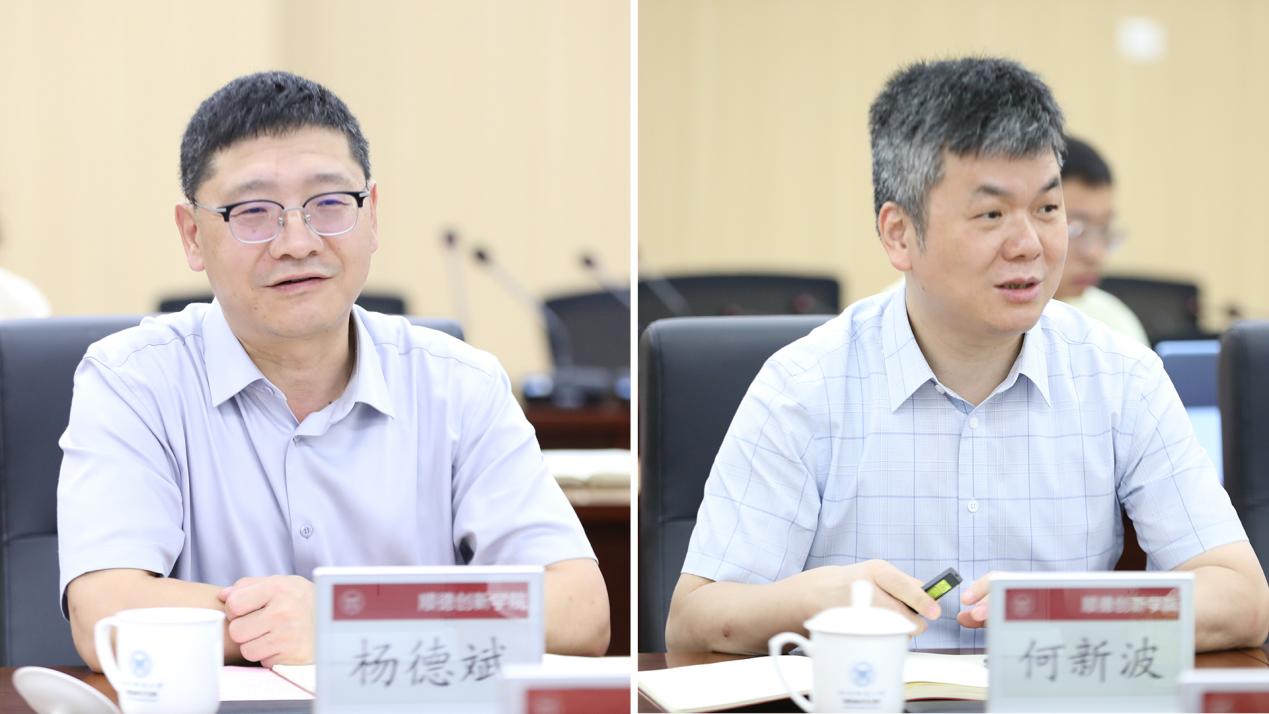 杨德斌(左一)主持会议、何新波(左二)介绍学院发展情况